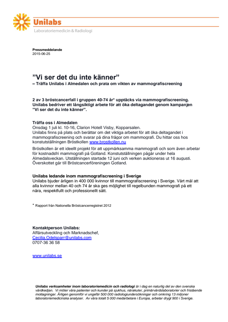 Unilabs finns på plats och berättar om det viktiga arbetet för att öka deltagandet i mammografiscreening och svarar på dina frågor om mammografi. Du hittar oss hos konstutställningen Bröstkollen www.brostkollen.nu