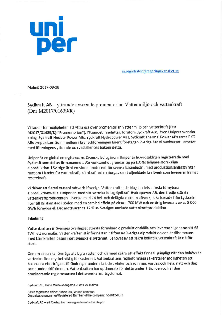 Unipers remissvar gällande promemorian vattenmiljö och vattenkraft 2017
