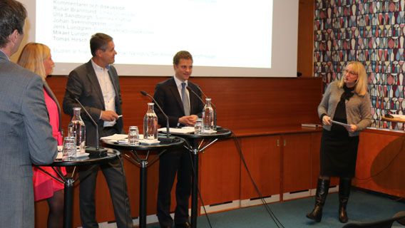 Johan Svenningsson, VD Uniper Sverige, och Per Klevnäs, VD för Copenhagen Economics får frågor från moderatorn på Svenskt Näringsliv, Maria Sunér-Fleming.