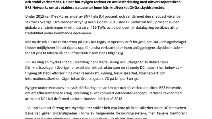 Nyligen undertecknades en avsiktsförklaring mellan Uniper och nätverksoperatören BRS Networks, om ett affärssamarbete kring utveckling av ett komplett datacenter-koncept. Parterna räknar med att ha ett DC i full drift med anslutna kunder i början på 2018.