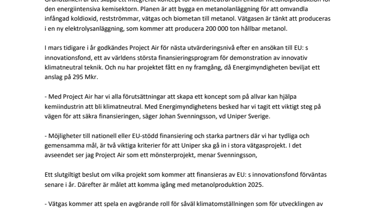 - Med Project Air har vi alla förutsättningar att skapa ett koncept som på allvar kan hjälpa kemiindustrin att bli klimatneutral. Med Energimyndighetens besked har vi tagit ett viktigt steg på vägen för att säkra finansieringen, säger Johan Svenningsson, vd Uniper Sverige.