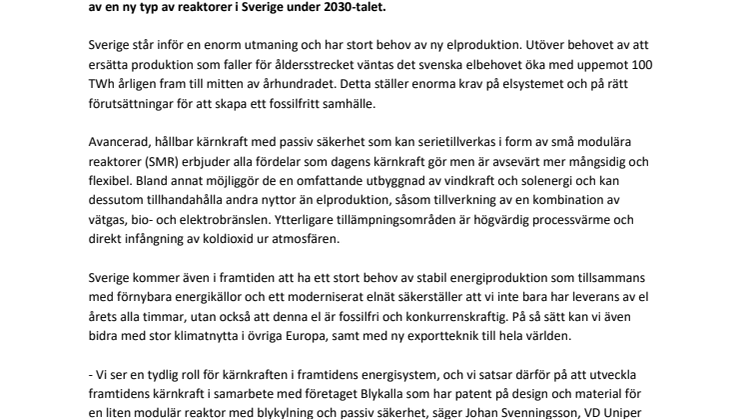 - Vi ser en tydlig roll för kärnkraften i framtidens energisystem, och vi satsar därför på att utveckla framtidens kärnkraft i samarbete med företaget Blykalla som har patent på design och material för en liten modulär reaktor med blykylning och passiv säkerhet, säger Johan Svenningsson, VD Uniper Sverige.