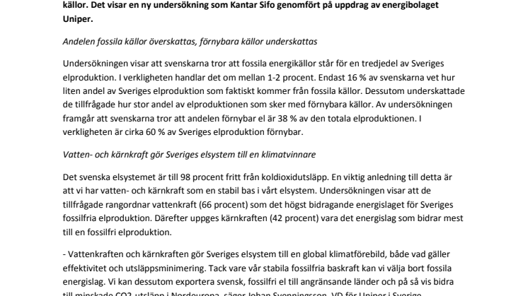 Hela 80 procent av svenskarna tror att Sveriges elproduktion kommer att behöva öka i framtiden. Samtidigt överskattar de flesta hur stor del av Sveriges elproduktion som kommer från fossila källor. Det visar en ny undersökning som Kantar Sifo genomfört på uppdrag av energibolaget Uniper.