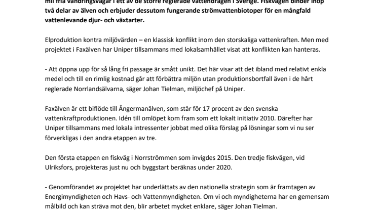 Nu inviger Uniper den andra av tre fiskvägar i övre Faxälven som tillsammans kommer att skapa 15 mil fria vandringsvägar i ett av de större reglerade vattendragen i Sverige. Fiskvägen binder ihop två delar av älven och erbjuder dessutom fungerande strömvattenbiotoper för en mångfald vattenlevande djur- och växtarter.