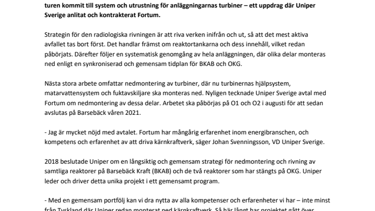Uniper kontrakterar Fortum för rivningsprojekt på Barsebäck Kraft och OKG