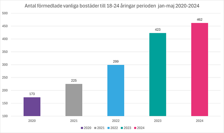 Antal förmedlade vanliga bostäder 18-24 åringar perioden jan-maj 2020-2024.png