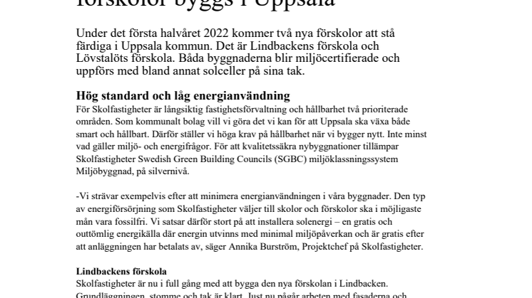 Under det första halvåret 2022 kommer två nya förskolor att stå färdiga i Uppsala kommun. Det är Lindbackens förskola och Lövstalöts förskola. Båda byggnaderna blir miljöcertifierade och uppförs med bland annat solceller på sina tak.