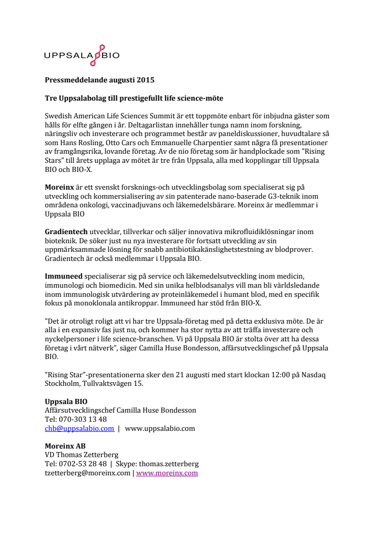 Swedish American Life Sciences Summit är ett toppmöte enbart för inbjudna gäster. Av de nio företag som är handplockade som ”Rising Stars” till årets upplaga av mötet är tre från Uppsala, alla med kopplingar till Uppsala BIO och BIO-X.