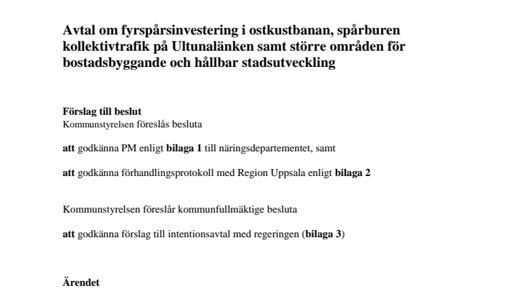 - Möjlighet till statlig delfinansiering av Ultunalänken med 900 miljoner kronor från stadsmiljöavtal