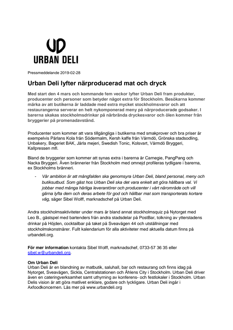 Med start den 4 mars och kommande fem veckor lyfter Urban Deli fram produkter, producenter och personer som betyder något extra för Stockholm. Besökarna kommer märka av att butikerna är laddade med extra mycket stockholmsvaror och att restaurangerna serverar en helt nykomponerad meny på närproducerade godsaker. I barerna skakas stockholmsdrinkar på närbrända dryckesvaror och ölen kommer från bryggerier på promenadavstånd.