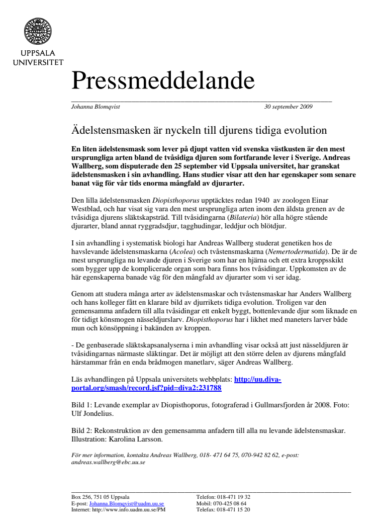 En liten ädelstensmask som lever på djupt vatten vid svenska västkusten är den mest ursprungliga arten bland de tvåsidiga djuren som fortfarande lever i Sverige. Andreas Wallberg, som disputerade den 25 september vid Uppsala universitet, har granskat ädelstensmasken i sin avhandling. Hans studier visar att den har egenskaper som senare banat väg för vår tids enorma mångfald av djurarter.