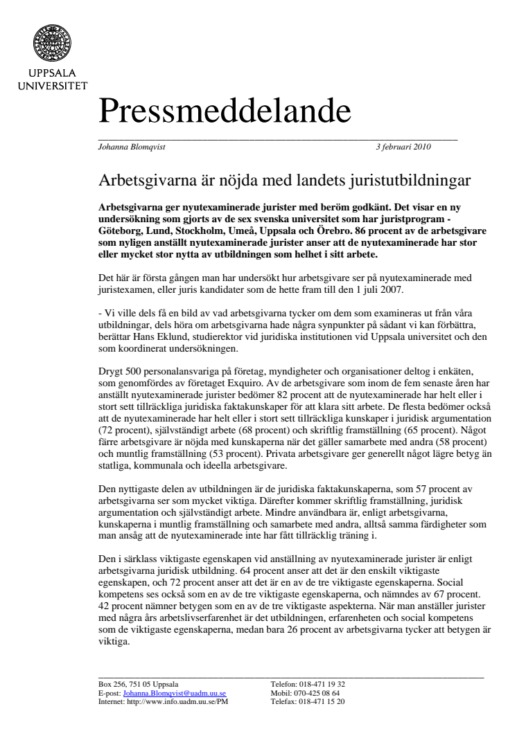 Arbetsgivarna ger nyutexaminerade jurister med beröm godkänt. Det visar en ny undersökning som gjorts av de sex svenska universitet som har juristprogram - Göteborg, Lund, Stockholm, Umeå, Uppsala och Örebro. 86 procent av de arbetsgivare som nyligen anställt nyutexaminerade jurister anser att de nyutexaminerade har stor eller mycket stor nytta av utbildningen som helhet i sitt arbete.