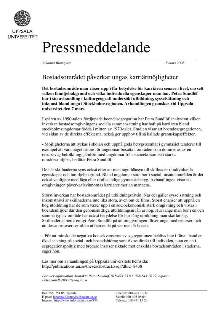 Det bostadsområde man växer upp i får betydelse för karriären senare i livet, oavsett vilken familjebakgrund och vilka individuella egenskaper man har. Petra Sundlöf har i sin avhandling i kulturgeografi undersökt utbildning, sysselsättning och inkomst bland unga i Stockholmsregionen. Avhandlingen granskas vid Uppsala universitet den 7 mars.