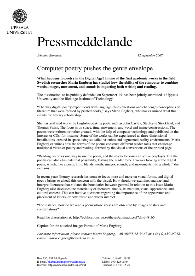 What happens to poetry in the Digital Age? In one of the first academic works in the field, Swedish researcher Maria Engberg has studied how the ability of the computer to combine words, images, movement, and sounds is impacting both writing and reading.