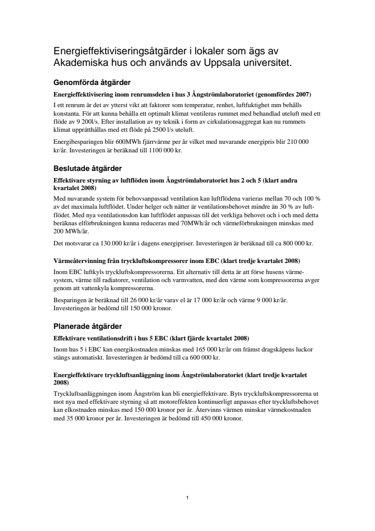 Geomförda och planerade energiåtgärder av Akademiska Hus i samarbete med Uppsala universitet.