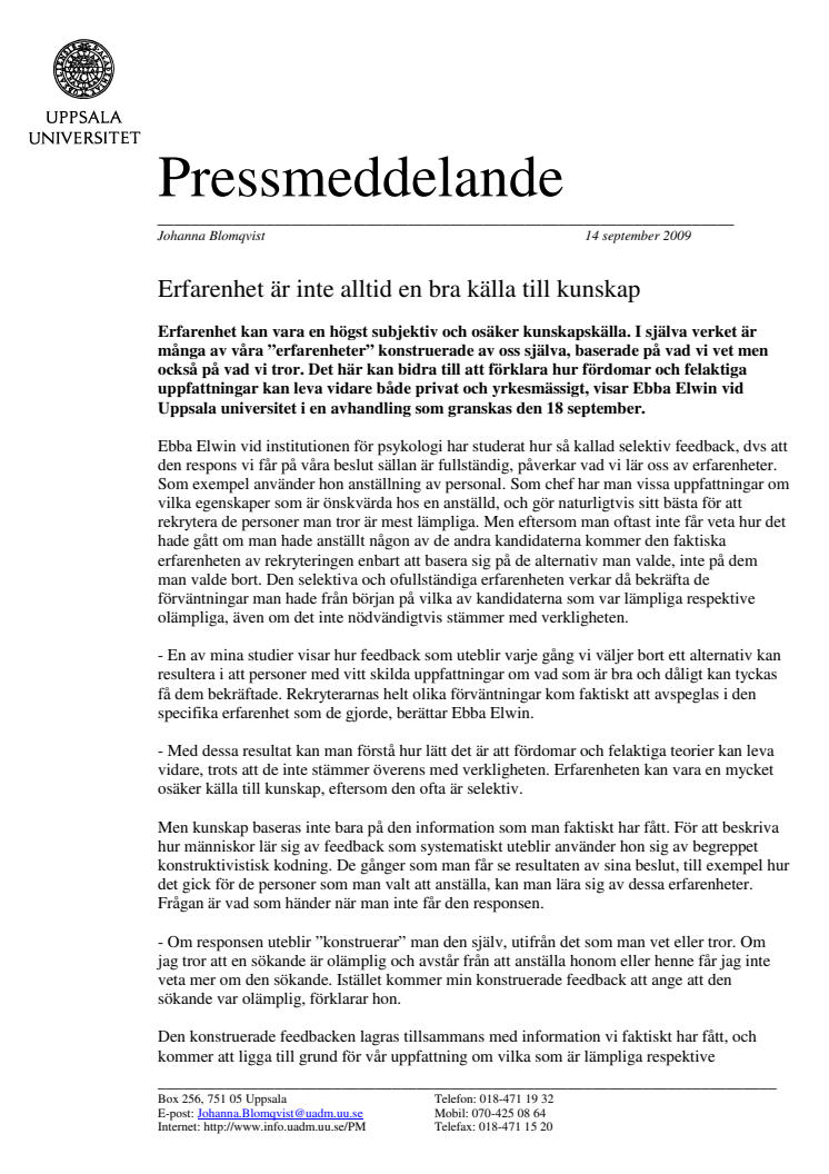 Erfarenhet kan vara en högst subjektiv och osäker kunskapskälla. I själva verket är många av våra "erfarenheter" konstruerade av oss själva, baserade på vad vi vet men också på vad vi tror. Det här kan bidra till att förklara hur fördomar och felaktiga uppfattningar kan leva vidare både privat och yrkesmässigt, visar Ebba Elwin vid Uppsala universitet i en avhandling som granskas den 18 september.
