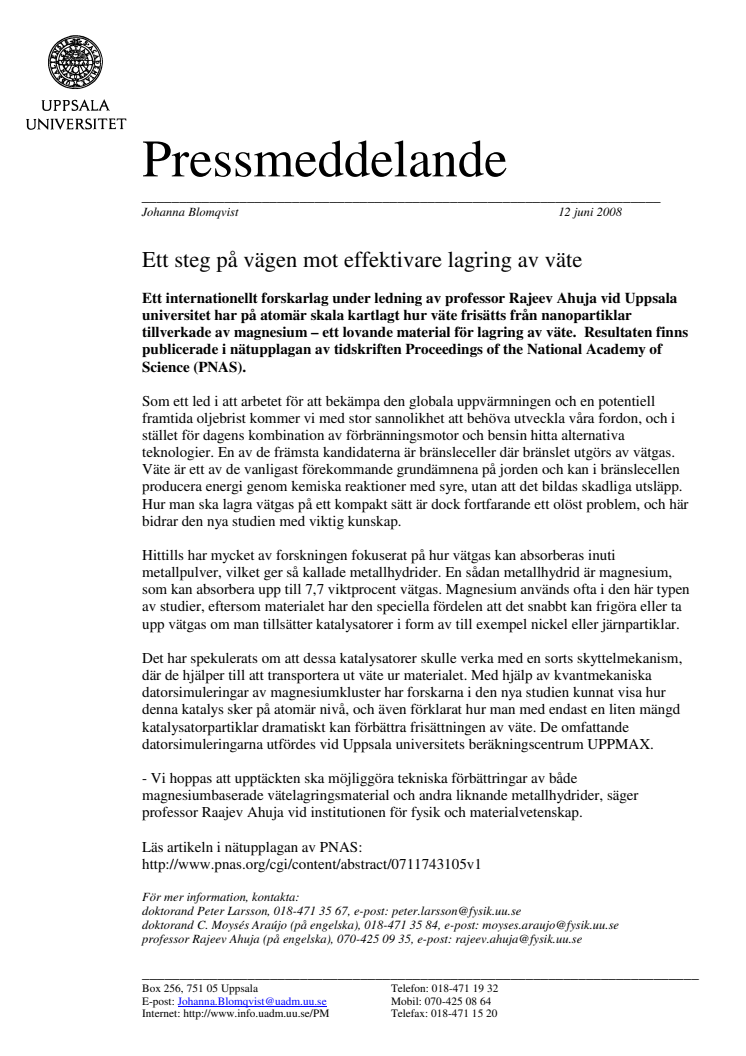 Ett internationellt forskarlag under ledning av professor Rajeev Ahuja vid Uppsala universitet har på atomär skala kartlagt hur väte frisätts från nanopartiklar tillverkade av magnesium – ett lovande material för lagring av väte. Resultaten finns publicerade i nätupplagan av tidskriften Proceedings of the National Academy of Science (PNAS).