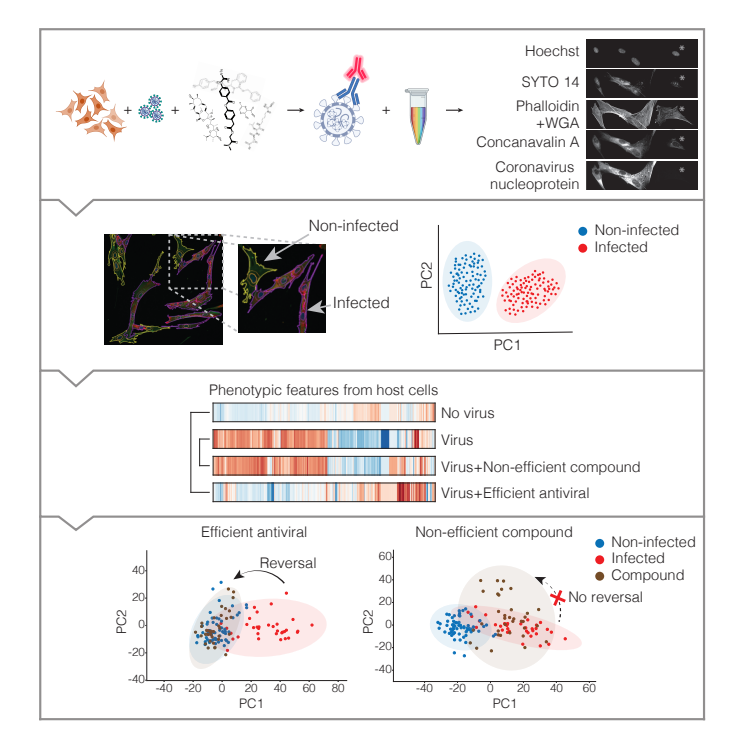 Grafiken illustrerar metoden, som kan användas både till screening för redan medicinskt tillgängliga läkemedel som skulle kunna återanvändas som antivirala medel, men också till screening för nya kemiska föreningar. Illustration: Jordi Carreras-Puigvert, delvis skapad med BioRender.com