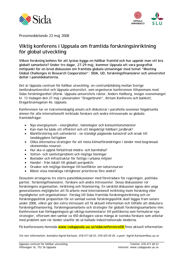 Pressmeddelande om konferensen "Global Challenges in research cooperation" som arrangeras av Sida och Centrum för hållbar utveckling vid Uppsala universitet och SLU, den 27-29 maj.