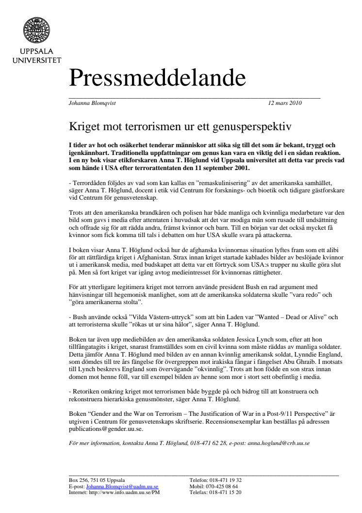 I tider av hot och osäkerhet tenderar människor att söka sig till det som är bekant, tryggt och igenkännbart. Traditionella uppfattningar om genus kan vara en viktig del i en sådan reaktion. I en ny bok visar etikforskaren Anna T. Höglund vid Uppsala universitet att detta var precis vad som hände i USA efter terrorattentaten den 11 september 2001.
