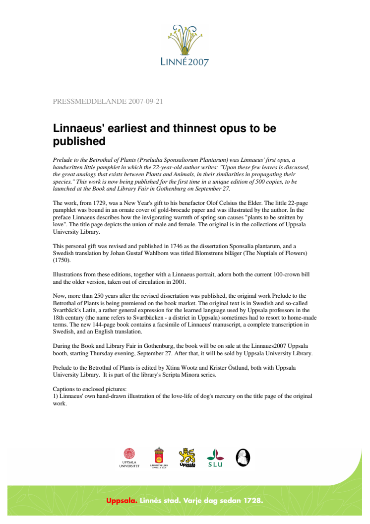 Prelude to the Betrothal of Plants was Linnaeus' first opus, a handwritten little pamphlet in which the 22-year-old author writes: "Upon these few leaves is discussed, the great analogy that exists between Plants and Animals, in their similarities in propagating their species." This work is now being published for the first time in a unique edition of 500 copies, to be launched on September 27.