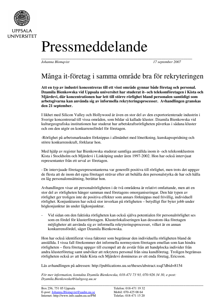 Att en typ av industri koncentreras till ett visst område gynnar både företag och personal. Dzamila Bienkowska vid Uppsala universitet har studerat it- och telekomföretagen i Kista och Mjärdevi, där koncentrationen har lett till större rörlighet bland personalen samtidigt som arbetsgivarna kan använda sig av informella rekryteringsprocesser. Avhandlingen granskas den 21 september.