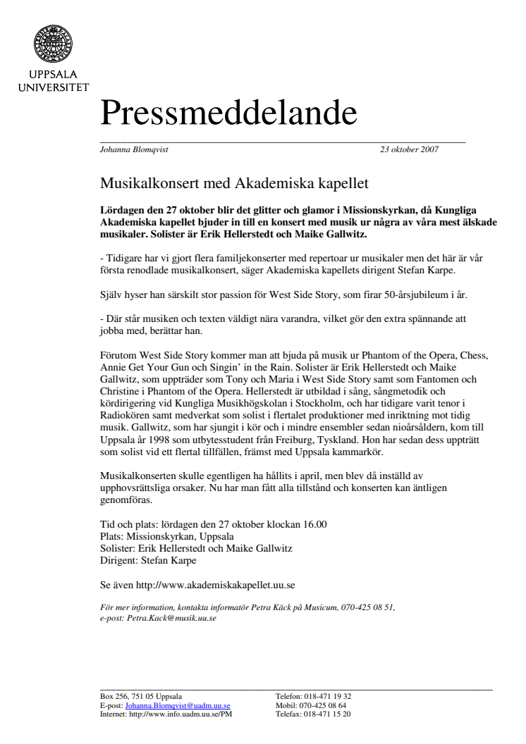 Lördagen den 27 oktober blir det glitter och glamour i Missionskyrkan, då Kungliga Akademiska kapellet bjuder in till en konsert med musik ur några av våra mest älskade musikaler. Solister är Erik Hellerstedt och Maike Gallwitz.
