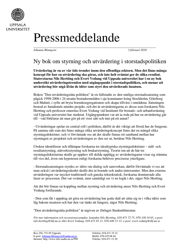 Utvärdering är en av vår tids trender inom den offentliga sektorn. Men det finns många koncept för hur en utvärdering ska göras, och inte helt oväntat ger de olika resultat. Nils Hertting och Evert Vedung vid Uppsala universitet har i en ny bok undersökt utvärderingstrenden med utgångspunkt i storstadspolitiken, och menar att utvärdering bör utgå ifrån de idéer som styrt den utvärderade insatsen.