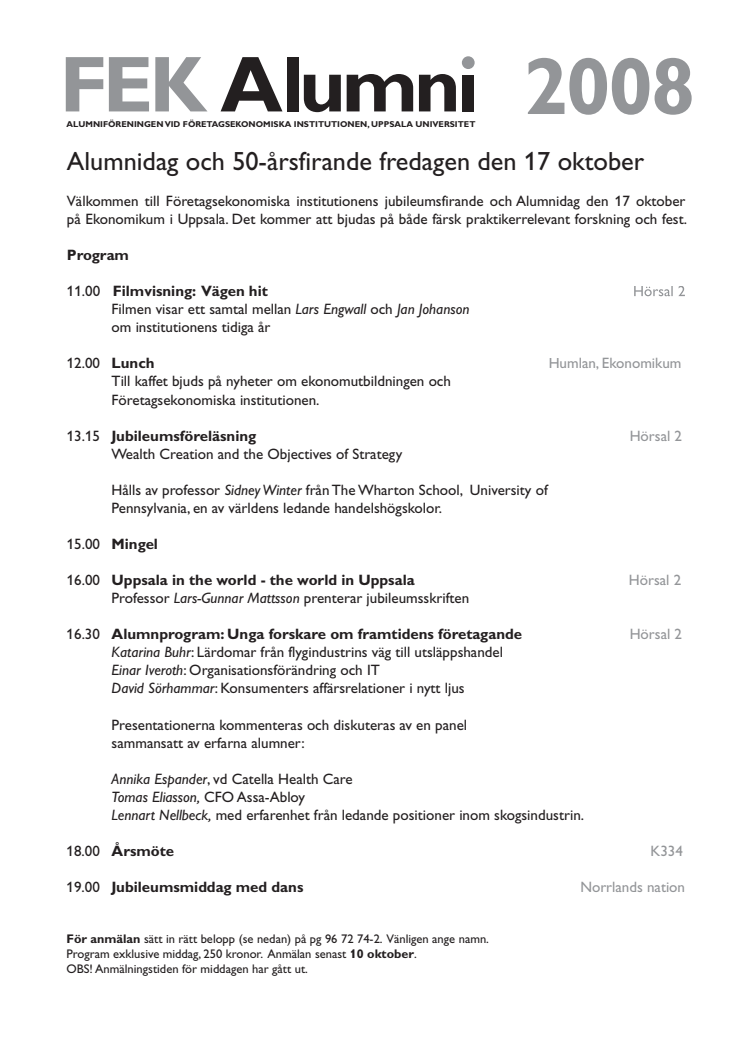 Program för alumndag och 50-årsjubileum på företagsekonomen, Uppsala universitet.