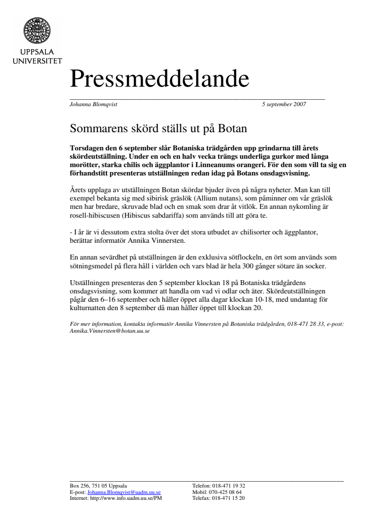 Torsdagen den 6 september slår Botaniska trädgården upp grindarna till årets skördeutställning. Under en och en halv vecka trängs underliga gurkor med långa morötter, starka chilis och äggplantor i Linneanums orangeri. För den som vill ta sig en förhandstitt presenteras utställningen redan idag på Botans onsdagsvisning.