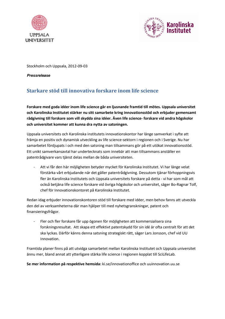 Forskare med goda idéer inom life science går en ljusnande framtid till mötes. Uppsala universitet och Karolinska Institutet stärker nu sitt samarbete kring innovationsstöd och erbjuder gemensamt rådgivning till forskare som vill skydda sina idéer. Även life science- forskare vid andra högskolor och universitet kommer att kunna dra nytta av satsningen.
