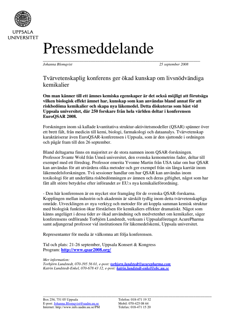 Om man känner till ett ämnes kemiska egenskaper är det också möjligt att förutsäga vilken biologisk effekt ämnet har, kunskap som kan användas bland annat för att riskbedöma kemikalier och skapa nya läkemedel. Detta diskuteras som bäst vid Uppsala universitet, där 250 forskare från hela världen deltar i konferensen EuroQSAR 2008.