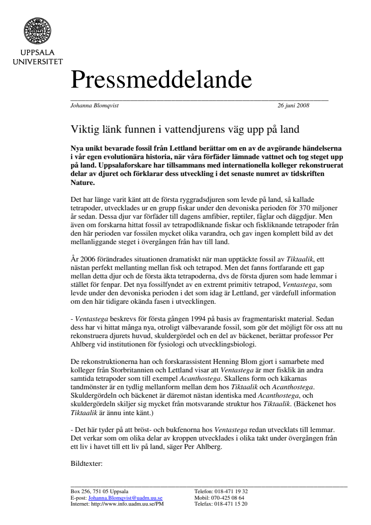 Nya unikt bevarade fossil från Lettland berättar om en av de avgörande händelserna i vår egen evolutionära historia, när våra förfäder lämnade vattnet och tog steget upp på land. Uppsalaforskare har tillsammans med internationella kolleger rekonstruerat delar av djuret och förklarar dess utveckling i det senaste numret av tidskriften Nature.