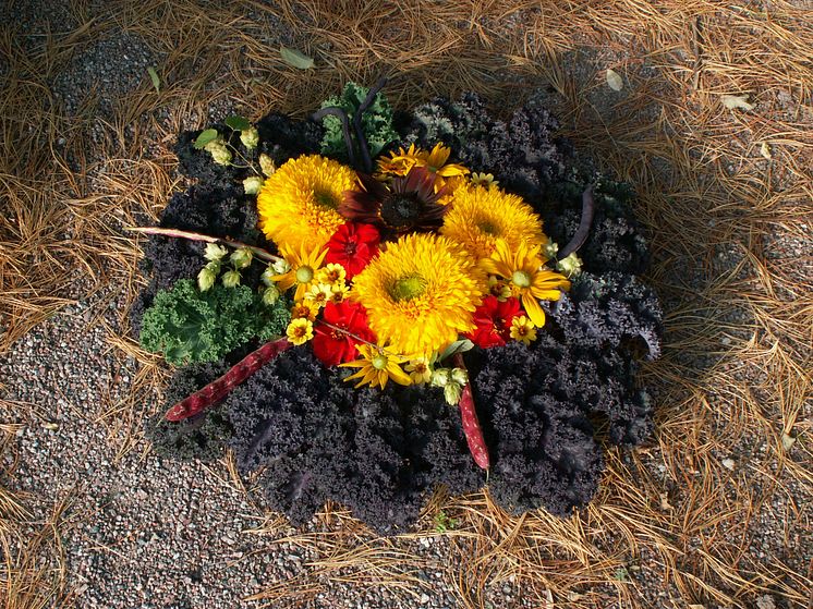 Blomsterarrangemang av trädgårdsmästare Petra Holmgren vid Botaniska trädgården, med bland annat solrosor och grönkål. Foto: Magnus Lidén