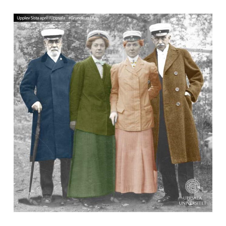 Bild av en av fotoskärmarna som kommer att ställas upp framför universitetsbiblioteket Carolina Rediviva inför Sista April. Bilden är ett fotomontage av bilder från förra sekelskiftet ur bibliotekets arkiv. Besökare kan fotografera sig som en av personerna.