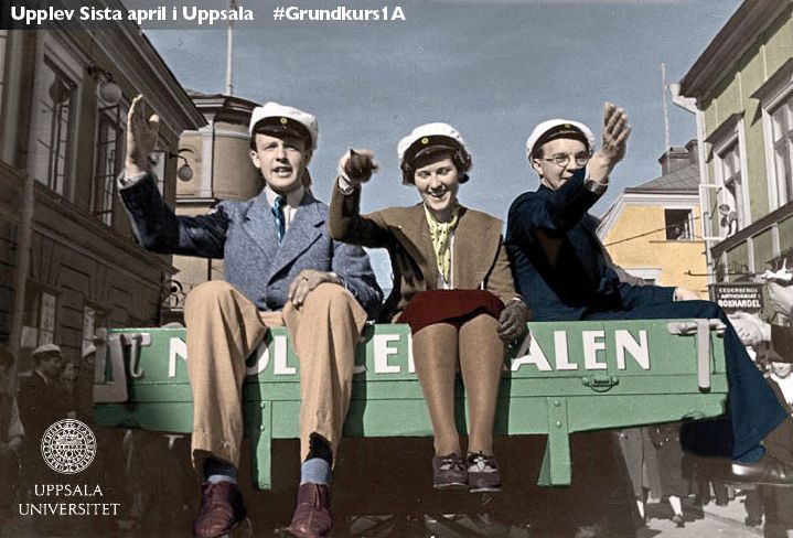 Bild av en av fotoskärmarna som kommer att ställas upp framför universitetsbiblioteket Carolina Rediviva inför Sista April. Bilden, som hämtats ur bibliotekets arkiv, är tagen under Sista april 1937 av fotograf Per Kjellén. Besökare kan fotografera sig som en av personerna.
