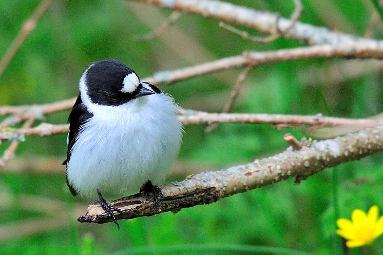 Hanar av arten halsbandsflugsnappare med den vita pannfläcken tydligt synlig.