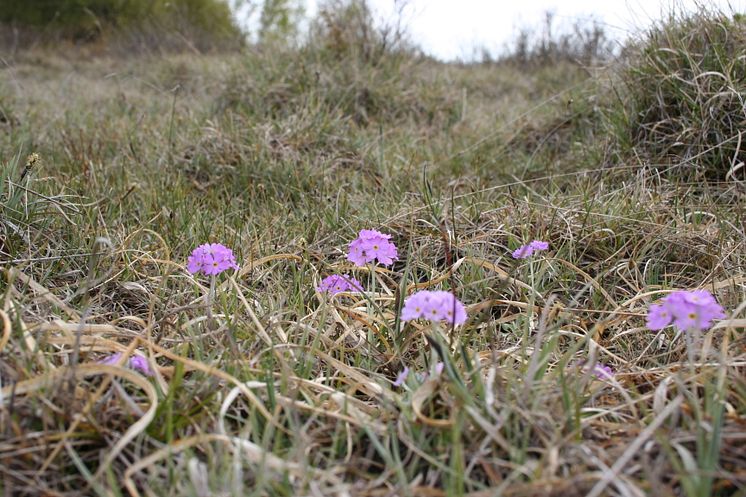 Bland de sex långstjälkade majvivorna växer två kortstjälkade som knappt syns.