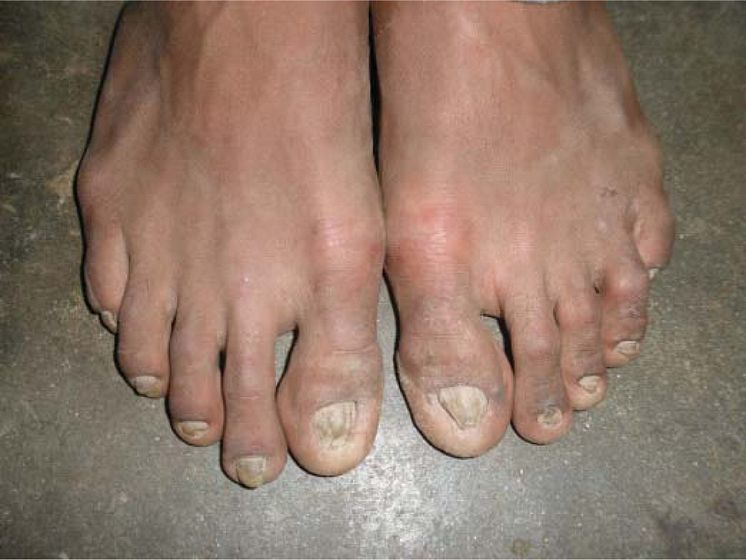 Fötter från en patient med mutationer i genen för Frizzled 6. Naglarna är kraftigt deformerade, tjocka och "klolika", de fäster inte i den förminskade nagelbädden, sitter löst och lossnar lätt.