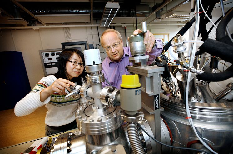 Tillverkning av smarta fönster på Ångströmlaboratoriet, på bilden forskarna Claes-Göran Granqvist och Shuyi Li.