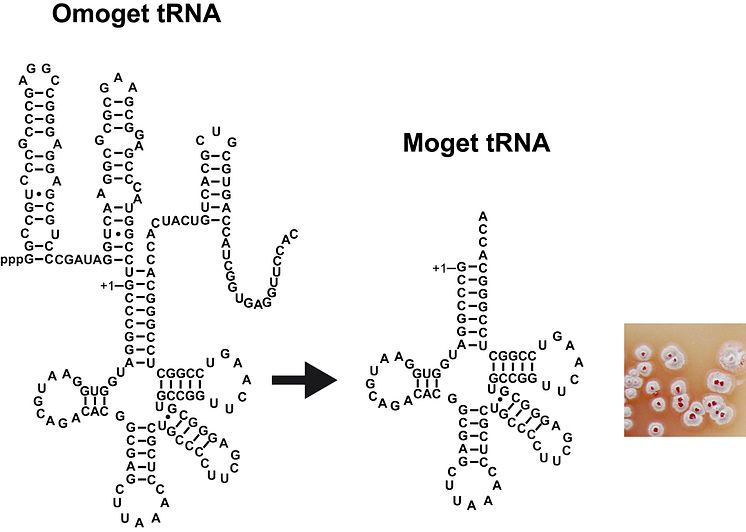 Bilden visar omoget (vänster) och moget (mitten) tRNA från bakterien Streptomyces coelicolor, samt kolonier av samma bakterie (höger).