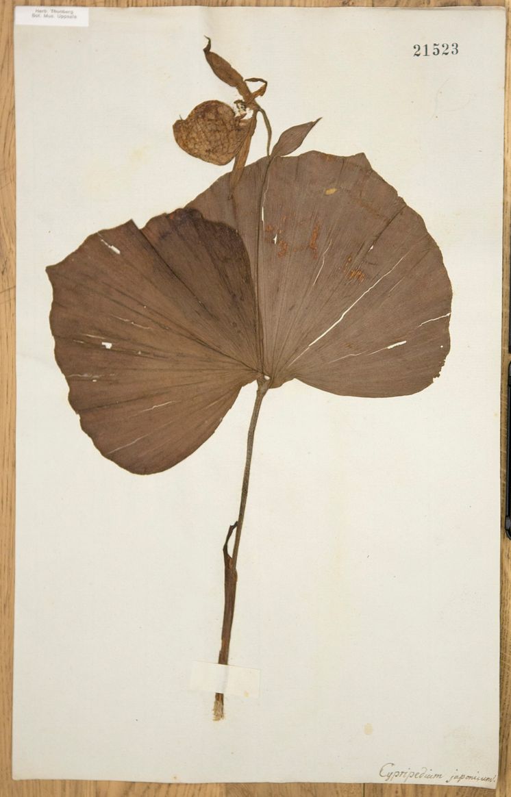 Växten på bilden är en Cypripedium japonicum (en släkting till vår guckosko) och samlades av Thunberg själv i Japan. Arket är dessutom typexemplaret för namnet Cypripedium japonicum som Thunberg beskrev 1784.