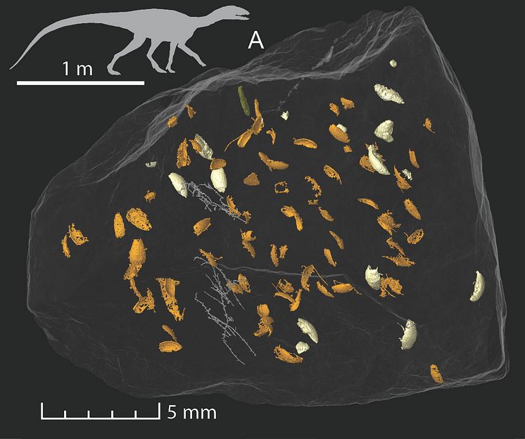 Med hjälp av synkrotronmikrotomografi 3D-rekonstruerades skalbaggsfossilen virtuellt medan de fortfarande var kvar i koproliten (fossilt bajs).