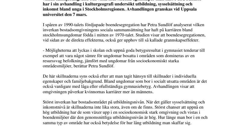 Det bostadsområde man växer upp i får betydelse för karriären senare i livet, oavsett vilken familjebakgrund och vilka individuella egenskaper man har. Petra Sundlöf har i sin avhandling i kulturgeografi undersökt utbildning, sysselsättning och inkomst bland unga i Stockholmsregionen. Avhandlingen granskas vid Uppsala universitet den 7 mars.