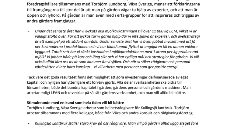Lönsamheten i Kullingsjö Lantbruk, som drivs av Kristoffer och Tobias Kullingsjö, har även i svåra ekonomiska tider förbättrats år för år. Kristoffer, som är en av Mjölkföretagardagarnas föredragshållare tillsammans med Torbjörn Lundborg, Växa Sverige, menar att förklaringarna till framgångarna till stor del är att man på gården vågar ta hjälp av experter, och att man är öppen och lyhörd. På gården är man även med i erfa-grupper för att inspireras och triggas av andra gårdars framgångar.