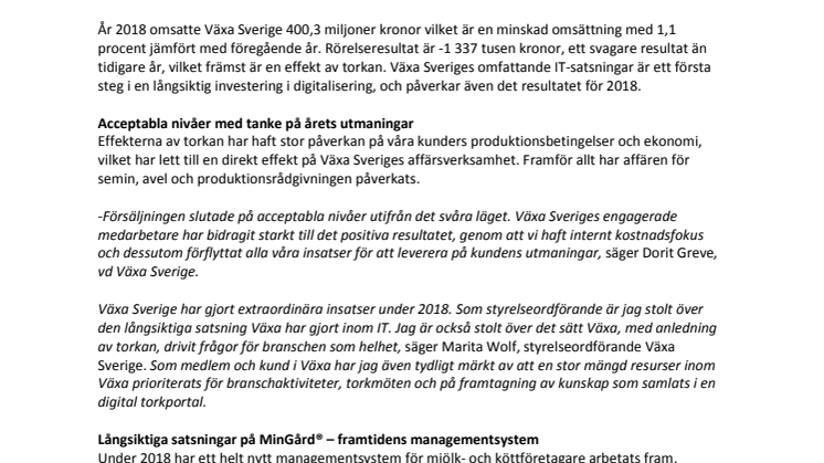 Växa Sverige har gjort extraordinära insatser under 2018. Som styrelseordförande är jag stolt över den långsiktiga satsning Växa har gjort inom IT. Jag är också stolt över det sätt Växa, med anledning av torkan, drivit frågor för branschen som helhet, säger Marita Wolf, styrelseordförande Växa Sverige. Som medlem och kund i Växa har jag även tydligt märkt av att en stor mängd resurserinom Växa prioriterats förbranschaktiviteter, torkmöten och på framtagning av kunskap som samlats i en digital torkportal.