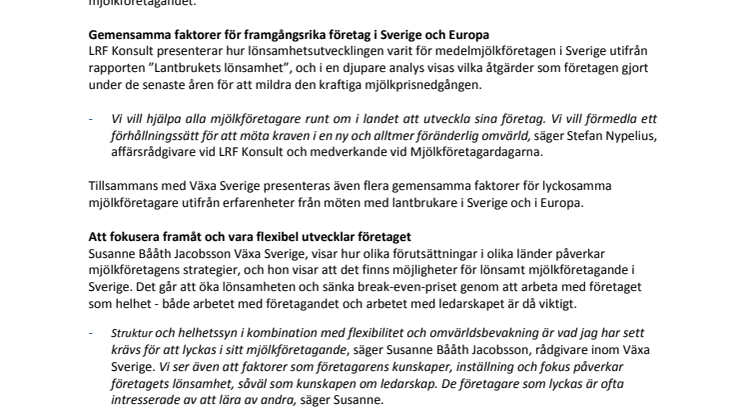 Susanne Bååth Jacobsson Växa Sverige, visar hur olika förutsättningar i olika länder påverkar mjölkföretagens strategier, och hon visar att det finns möjligheter för lönsamt mjölkföretagande i Sverige. Det går att öka lönsamheten och sänka break-even-priset genom att arbeta med företaget som helhet - både arbetet med företagandet och arbetet med ledarskapet är då viktigt.