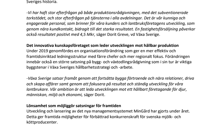 -Vi har haft stor efterfrågan på både produktionsrådgivningen, med det subventionerade torkstödet, och stor efterfrågan på tjänsterna i alla avdelningar. Det är vår kunniga och engagerade personal, som brinner för våra kunders och lantbruksföretagens utveckling, som genom nära kundkontakt, bidragit till det starka resultatet. En fastighetsförsäljning påverkar också resultatet positivt med 4,5 Mkr, säger Dorit Greve, vd Växa Sverige.