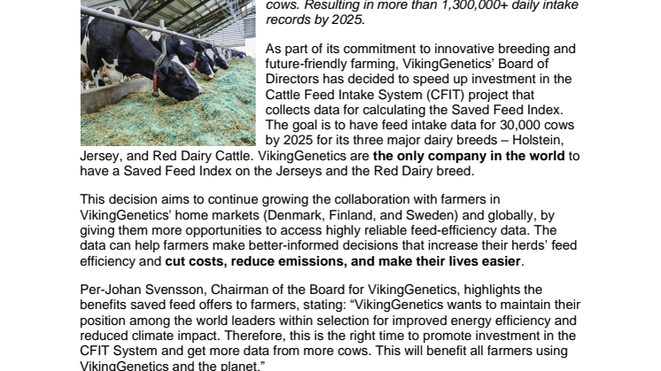 This decision aims to continue growing the collaboration with farmers in VikingGenetics' home markets (Denmark, Finland, and Sweden) and globally, by giving them more opportunities to access highly reliable feed-efficiency data. The data can help farmers make better-informed decisions that increase their herds’ feed efficiency and cut costs, reduce emissions, and make their lives easier.