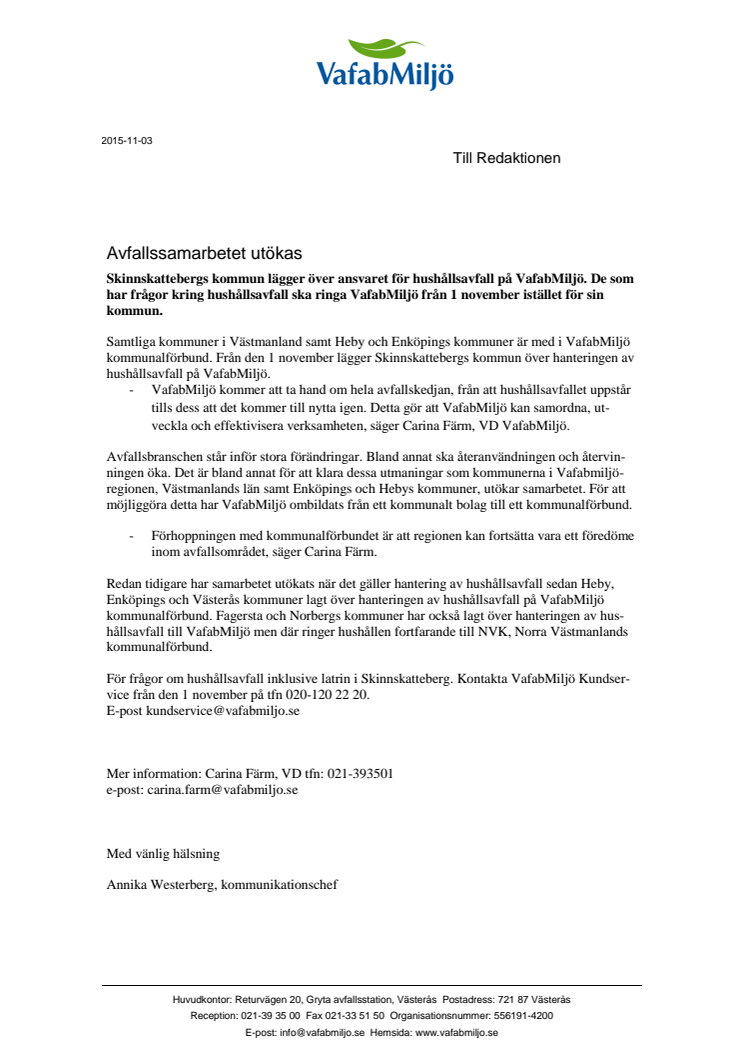 Skinnskattebergs kommun lägger över ansvaret för hushållsavfall på VafabMiljö. De som har frågor kring hushållsavfall ska ringa VafabMiljö från 1 november istället för sin kommun.